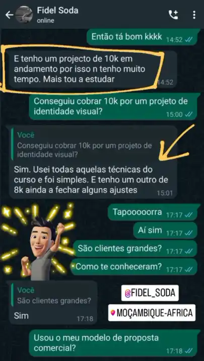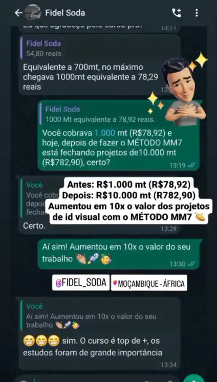E foi pensando nisso, que desenvolvi o MÉTODO CMM, um método de 7 etapas onde te ensino, passo a passo, a como criar uma marca memorável que encanta os seus clientes (e os clientes dos seus clientes), turbina o seu portfólio, te liberta do bloqueio criativo, te ensina a vender o seu trabalho da forma certa, aplicando gatilhos mentais, coloca mais grana no seu bolso e te torna um profissional de alto nível!